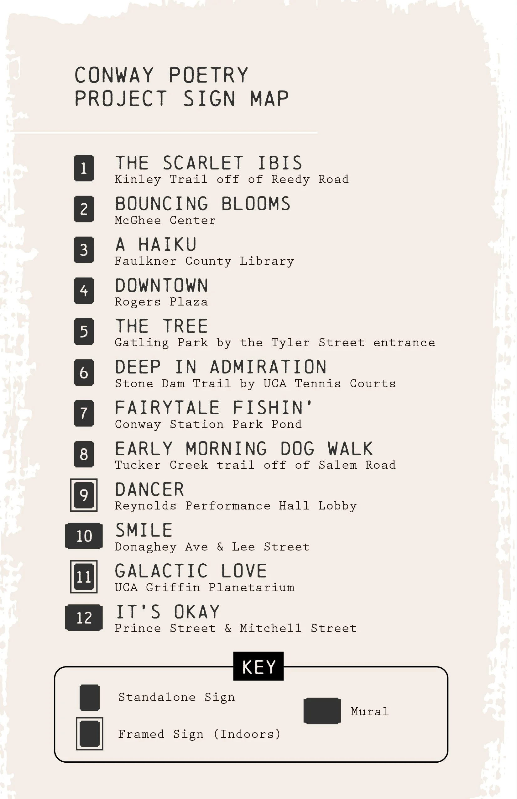 As part of National Poetry Month, April 2022, local non-profit Blackbird Arts Collective launched the Conway Public Poetry Project. Over fifty original submissions were received from city residents, both children and adults. A committee composed of members from Blackbird Arts Collective, Conway Public Art Committee, Hendrix College, and the Creative Institute of Central Arkansas chose twelve poems for semi-permanent installation around the city of Conway.